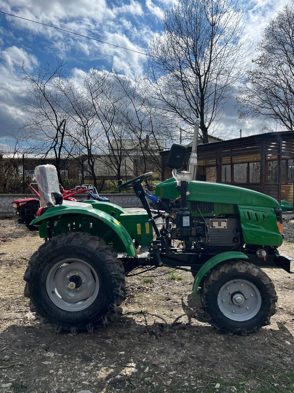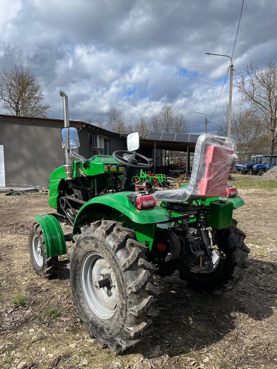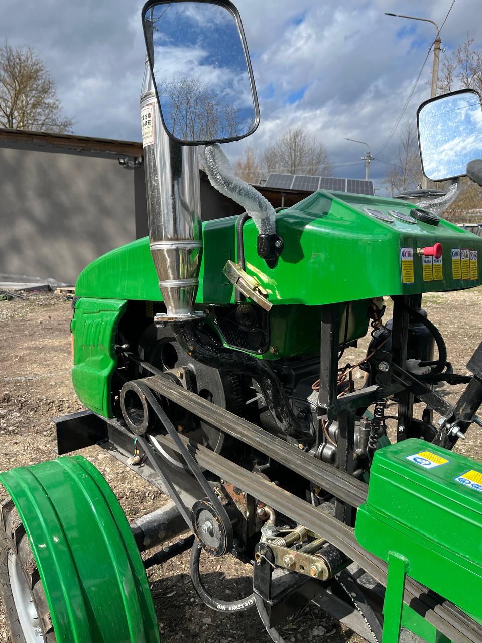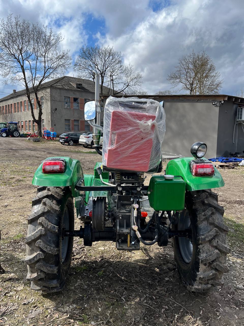 Міцна рама, агротехнічний просвіт 350 мм і колеса з покращеним зчепленням (передні 6.00-12, задні 9.50-16) дозволяють ефективно працювати на оброблених і цілинних землях. Гідравлічна система з окремим шестеренчастим насосом і баком об’ємом 4 літри забезпечує роботу з навісним обладнанням мотоблочного типу.