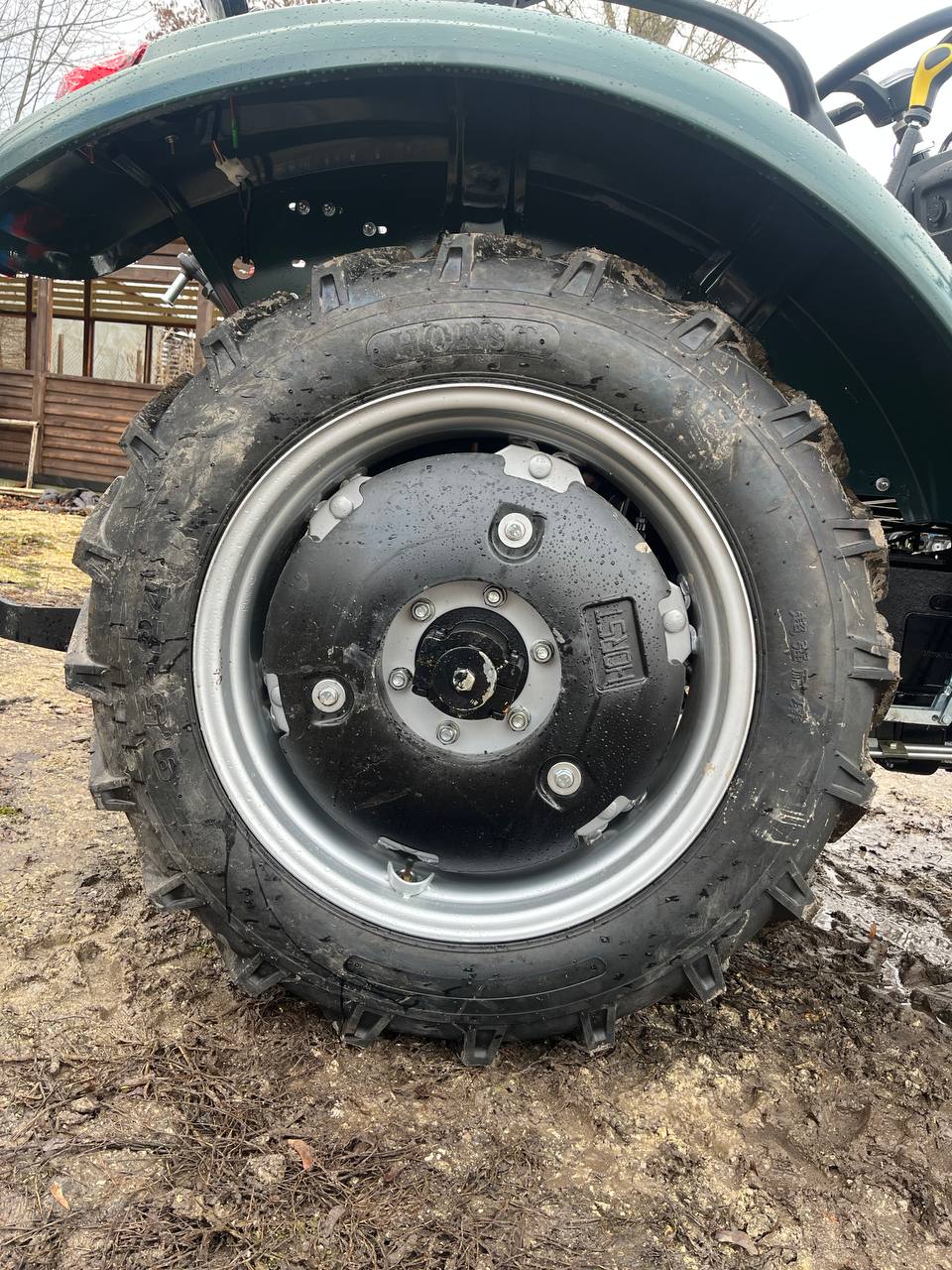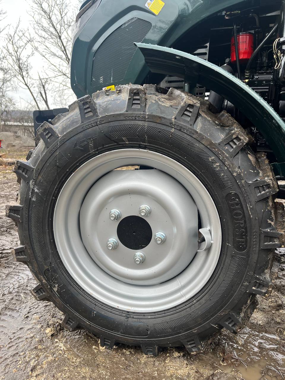 Колісна формула 4×4 у поєднанні з шинами 7,5-16 спереду та 11,2-24 ззаду забезпечує чудове зчеплення з ґрунтом і стабільність навіть на складних поверхнях. Розбірні диски коліс спрощують технічне обслуговування, а розтяжки на навісці додають міцності. Передні вантажі (6×11 кг) і задні (2×25 кг) дозволяють налаштувати масу трактора під конкретні умови. Підніжки з обох боків полегшують доступ до сидіння, а маслянки на елементах зчеплення спрощують догляд за машиною.